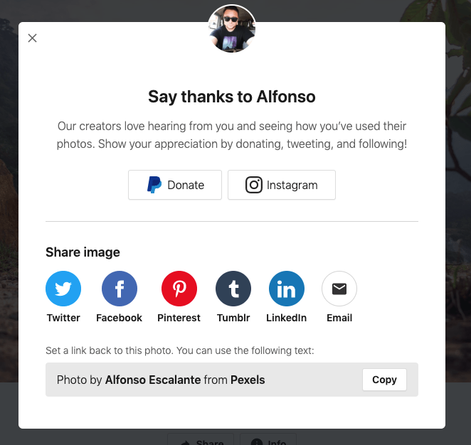 Al darle click al boton de share, copiamos el texto para dar crédito a la fotografía seleccionada. Este texto se añadirá en la parte inferior (sección de write caption) cuando subamos la fotografía a WordPress