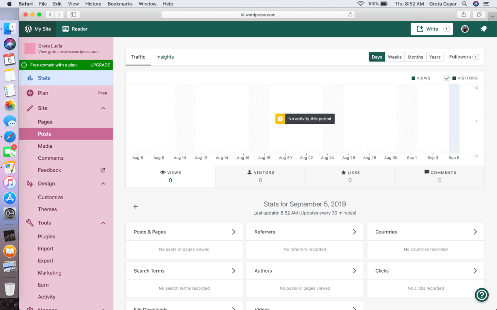 En el blog de la clase vamos a ver que mientras más vieja la publicación más abajo va a estar, esto es debido al tema del cual la profesora escogió. Cada uno de nosotros se supone que haya elegido un tema que nosotros pensemos que sea relevante con nuestro blog. El tema se elige, cuando uno entra a “My Sites”, “Design” y después “Theme”; de ahi uno elige el tema que quiere, después que sea parte del plan que tenga. Para esta clase nosotros elegimos el plan gratis, a sí es que los temas que nos tocaran serán los gratis.