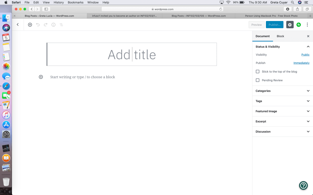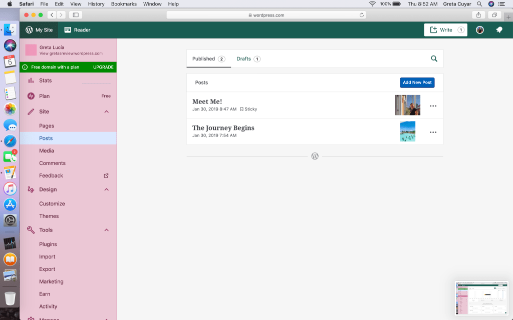 Para crear un post, uno debe de verificar en el lado izquierdo de la pantalla (donde mismo encontramos “Design”) donde dice site, ahi la segunda opción dice “Posts”. Cuando la presionas te van a salir todos los posts que ya has hecho, más te ve a dar la opción de crear uno nuevo. Esta opción la vas a encontrar en la esquina derecha de donde están tus post antiguos. Cuando ya acabes de escribir tu post, te vas a dar cuenta que en el esquina superior derecha dice publish, cuando presionas ese botón el post va a aparecer en tu blog. Si lo quieres editar lo único que tienes que hacer es volver a buscar el enlace de “Posts” en “Sites” escoger el post, darle click y editarlo. Ahora en vez de que te salga “Publish” te va a salir “Update”; porque los que estas haciendo es adquiriendo algo nuevo o retirando algo del post que ya esta publicado.