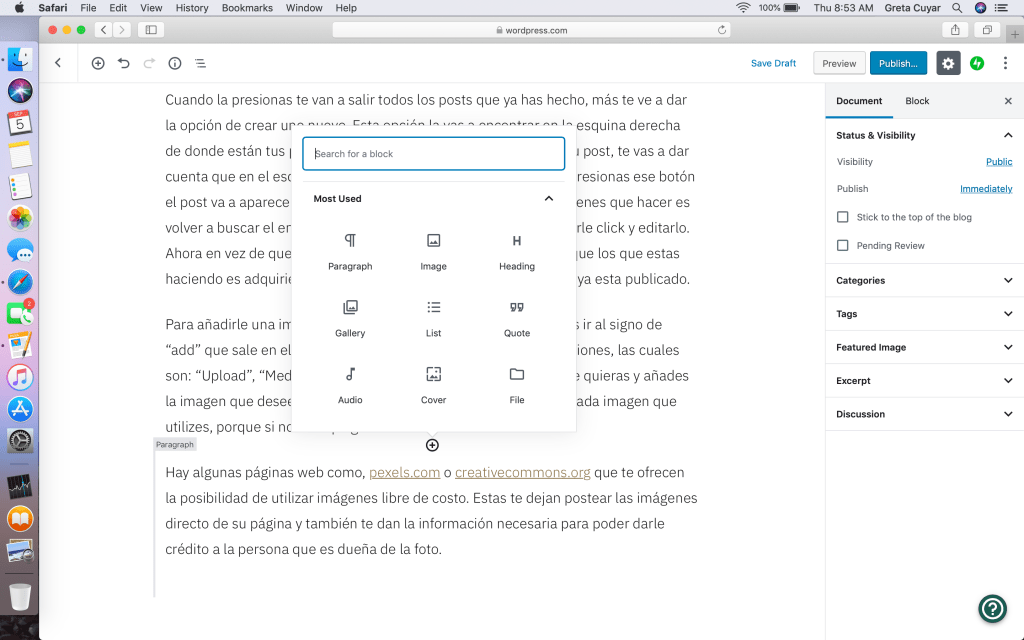 Para añadirle una imagen al post, lo único que tienes que hacer es ir al signo de “add” que sale en el post, darle y elegir imagen. Ahi te da tres opciones, las cuales son: “Upload”, “Media Library” o “Add URL”. De ahi tu eliges la que quieras y añades la imagen que desees. Recuerda, que le tienes que dar crédito a cada imagen que utilizes, porque si no seria plagio.