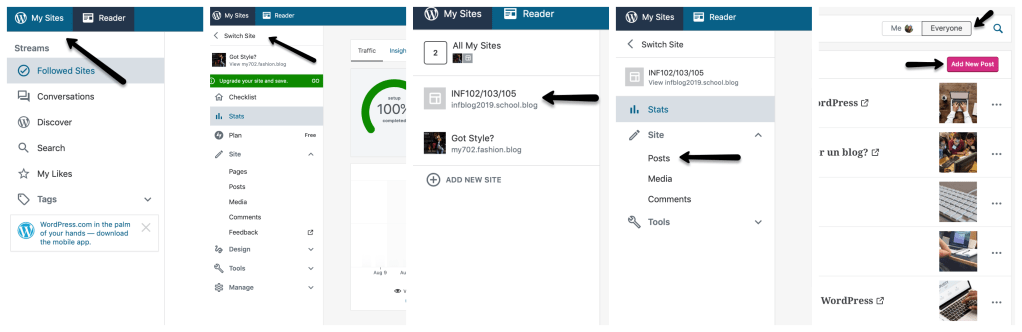 Comenzamos con cómo escribir un post en el blog de la clase. Para escribir tu articulo primero tienes que acceder a tu cuenta de WordPress. Luego de acceder a tu cuenta, oprimes la opción de “switch sites” que aparece en la esquina izquierda de la pantalla. Después, selecciona el blog de la clase. Cuando ya estes en el blog, oprime “create post” para escribir tu articulo. Recuerda presionar el botón de “for everyone” para que todos puedan verlo.