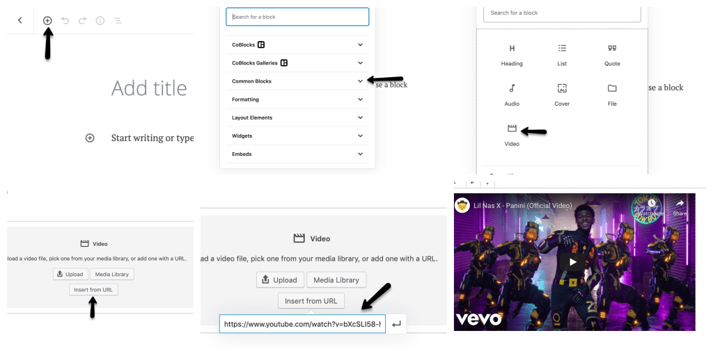 Para poner un vídeo en tu articulo, oprime el botón que parece una cruz “+” y selecciona la opción de “common blocks”. Luego, oprime la opción de vídeo. Cuando tengas el vídeo de tu preferencia, copia a la dirección de la pagina (URL). Una vez tengas el URL, pega la dirección en el espacio proveído del bloque. Recuerda, si el vídeo es obtenido de “YouTube” no haría falta de acreditarlo ya que la plataforma lo hace por ti. También intente que los vídeos sean cortos.
