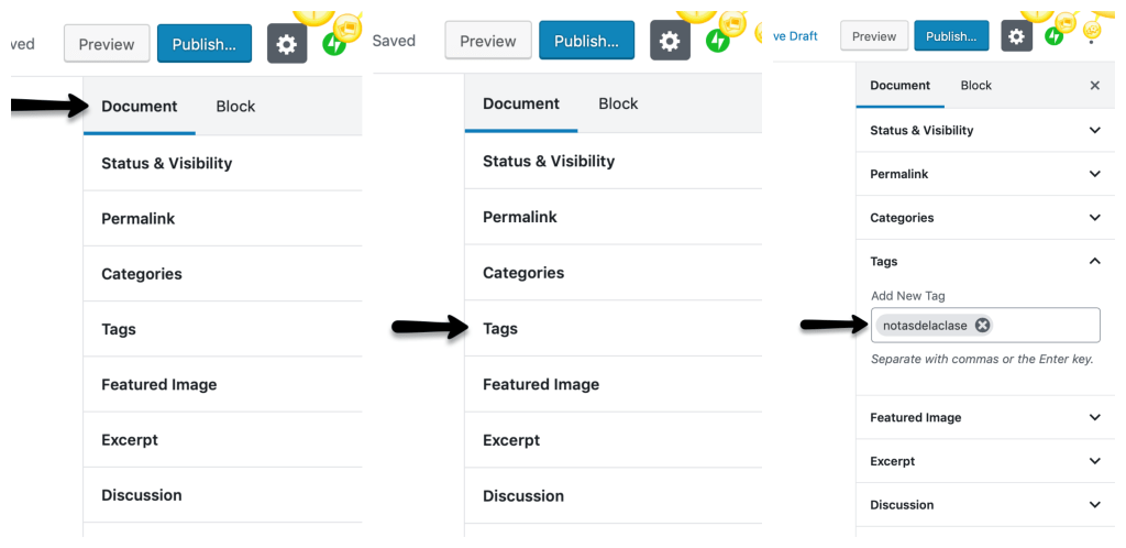 Continuamos con los ”tags”. Los ”tags” se usan mayormente para facilitar la búsqueda de un articulo usando palabras relacionadas a el tema. Para añadir un ”tag”, oprime la opción de ”document” que está localizada en la parte derecha de la pantalla. Luego, selecciona la opción de ”tags”. Donde dice “add new tag” escribe las palabras claves de tu preferencia. Para separar las palabras claves usa una coma ( , ). Recuerda que para tu articulo de la clase necesitas utilizar ”tags”. El “tag” de la clase es “notasdelaclase”, no olvides incluirlo en tu articulo.