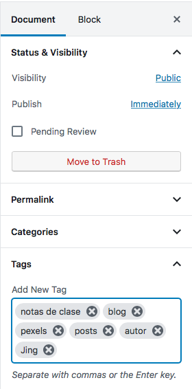 - En el recuadro puedes escribir por ejemplo, la palabra “salón” y le das ENTER o a la COMA (,) para crear un tag. Luego escribes el otro tag y así continuas sucesivamente hasta crear los tags que desees.