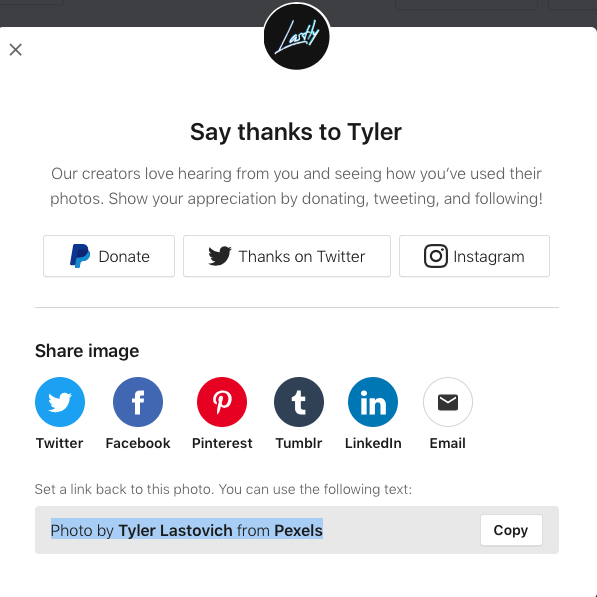 3. Te aparecerá, por ejemplo ”Photo by Tyler Lastovich from Pexels” y seleccione el recuadro que dice “ Copy”