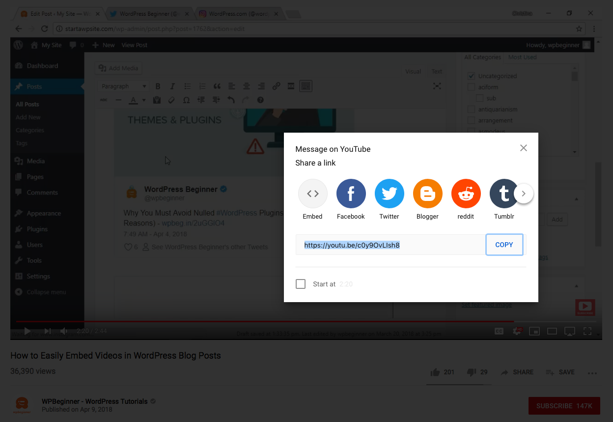 4. Luego de presionar ” Copy” vas a tu texto o a tu “post” y das “ Click” en donde dice “ Start Writing or Type/ To choose a Block” y presionas en el teclado CTRL+V para pegar o “ Paste” el crédito que se le dará al autor.
