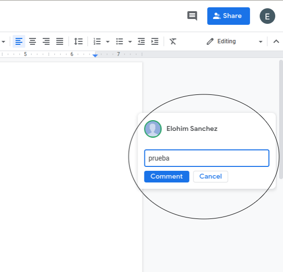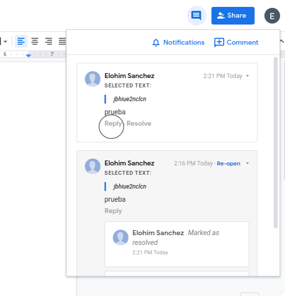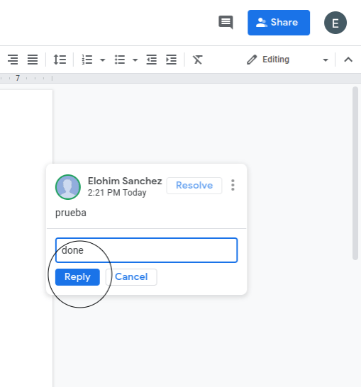 En medio de explicar las ventajas de estas herramientas, la profesora anunció que la asignación de la primera nota será completamente virtual y está prohibido reunirse y que esta será explicada en otro momento. Después de esto, habla sobre otra herramienta dentro de Google Docs que seria “comment”. “comment” es una herramienta para hacer un comentario directamente en el documento que solo los participantes podrán ver. Para poder hacer uso de esta herramienta, tienen que darle “click” al icono que está al lado de “share” y después a “comment”. Ahi escribes tu comentario y le das a “comment” para enviarlo. Para poder responder le das al icono de “comment”, y le das “reply” debajo del comentario, escribes tu respuesta y lo envías. Si el usuario del primer comentario considera que ya se resolvió el posible problema, le da a “resolve” y el comentario desaparece.
