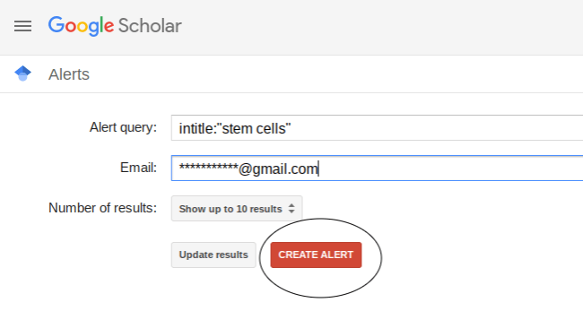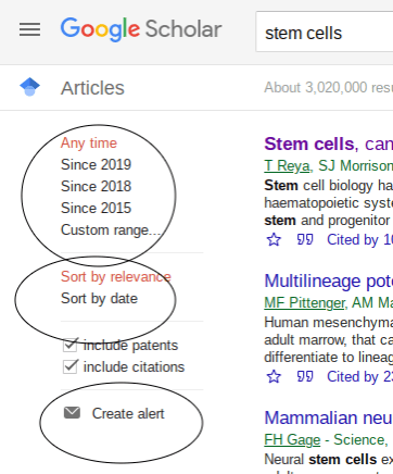 Una forma de buscar artículos más específicos sería buscarlos por fecha. Para poder hacer eso solo tienes que elegir cualquier fecha que esté a la izquierda de la página. Tambien, puedes utilizar la herramienta de “create alert” para que Google Scholars te avize cada vez que un articulo, relacionado a lo que estés buscando, sea publicado. esto se encuentra en la parte de abajo de la búsqueda de fechas. Le das “click” ahi y se va a abrir una nueva página; ahi le das “click” a “create alert” ya que el tema está puesto automáticamente.