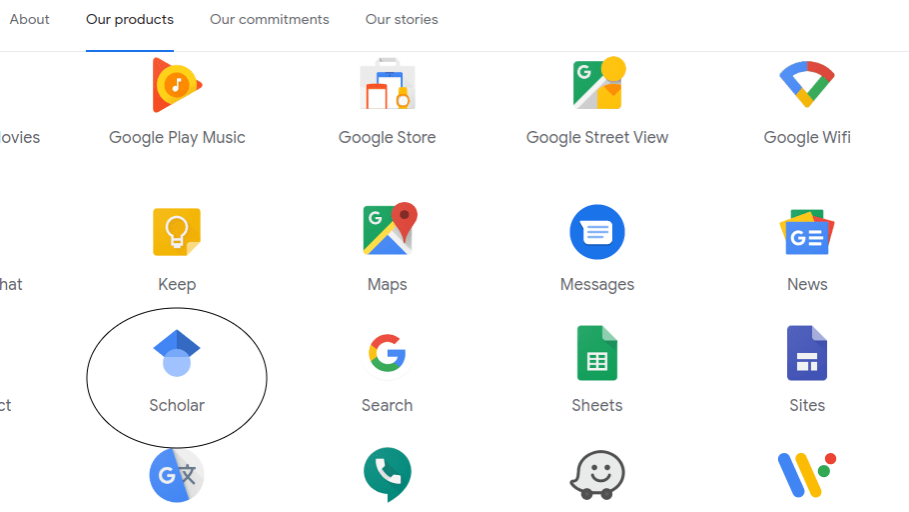 Si está buscando información confiable, la primera página no es necesariamente la mejor y más confiable. Ahora vamos a ver donde se puede encontrar información confiable. Esto se encuentra a través de una herramienta de Google que, para acceder la, tienes que darle “click” a los 9 puntos en la parte derecha de arriba de la pantalla. Le van adar “click” a more y despues a “even more”. Una página le se va a abrir enseñando herramientas de Google categorizadas. Va a bajar a donde dice “all products” y va a buscar la herramienta “Scholar”.