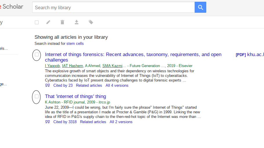 Ahora regresamos al tema de “scholars”. Scholars es un lugar donde puedes buscar, ampliamente, literatura academica como: articulos, thesis, libros y opiniones de la corte. Todo de parte de publicaciones académicas, sociedades profesionales y universidades. Es importante que cuando use Google Scholar, que se use con su cuenta de Email ya que todo que se busque se puede guardar en “my library” para uso rápido en el futuro. Ahora hay que darle “click” en “search Scholar” y busquen su tema nuevamente. Ahí pueden elegir cualquier artículo y van a poder ver de donde salio, el autor, el año, el título y una posible opción de descargar.