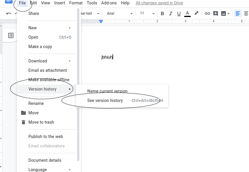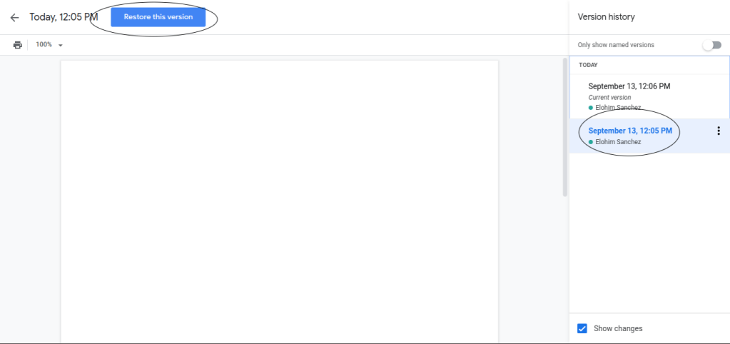 Un par de herramientas en particular que provee Drive es poder descargar tu documento y poder ver quien y cuando hizo algún tipo de cambio (anadir, borrar, editar) a su documento a través de “version history”. Para llegar a esto, debe darle “click” nuevamente a “New”, despues a “Google Docs”. Eso lo va a llevar a hacer un nuevo documento el cual vamos a usar como ejemplo. Para poder acceder el version history deben tener ya algo escrito, después va a ir a “file” y van a ver “version history” no muy abajo. le dan “click” ahi y despues a “see version history”. A la derecha le aparecerán todas la versiones de el documento que, en nuestro caso, serían dos ya que solo escribimos un par de cosas. la de arriba es la más reciente y la de abajo es la anterior de nuestro cambio. Si elige la segunda, podra regresar a esa version si le da “click” al cuadrado azul que dice “restore this version”. Si quiere descargar esta u otra versión, solo debe darle “click” a “file” y despues a “download”. Ahi tendra muchos tipos de formatos para elegir pero el más común es el de Microsoft Word o (.docx) y el pdf document o (.pdf). El mas recomendado seria el pdf.