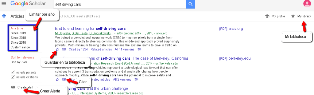Ahora les mostraré algunas opciones que tienen dentro de google scholar para guardar en tu propia biblioteca (donde puedes organizar por ‘labels’), citar, buscar por año (se recomienda no ir más allá de 5 años) y crear una alerta para que te enteres de cuando se publique algo nuevo del tema de interés y así de cierta forma la información es la que te busca.