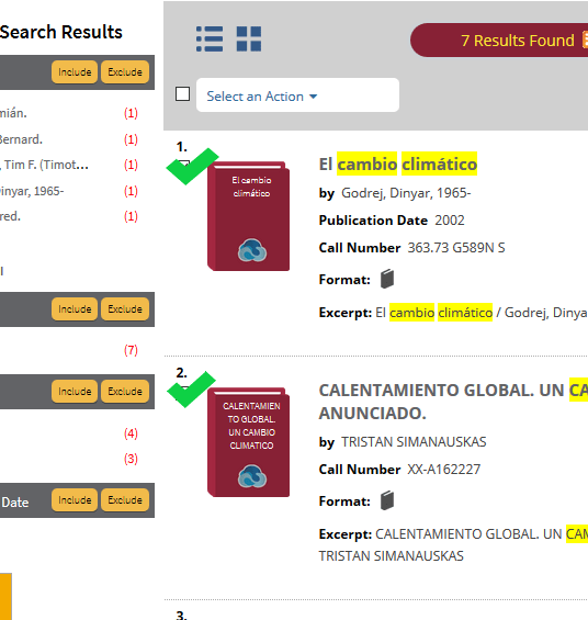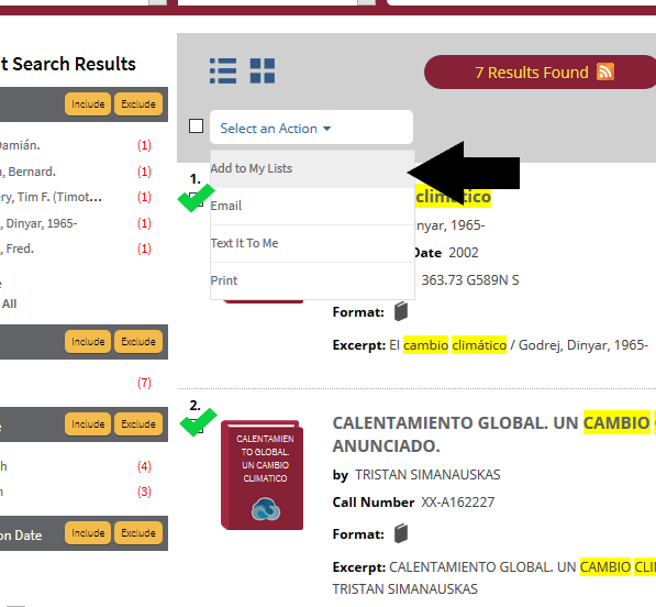 Estos resultados se pueden añadir a una carpeta que guarda los resultados que usted seleccione. También cuando quieras puedes hacer que te los envien por email, mensaje de texto o imprimes los resultado y los entregas en la biblioteca para que el bibliotecario no tenga que hacer la búsqueda y puedan conseguir tus selecciones más rápido. Aquí les muestro como hacerlo: