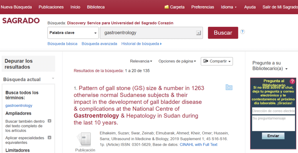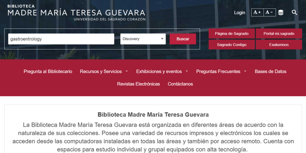 En adición a los libros físicos, la biblioteca tiene una manera de buscar referencias en línea. Después de entrar su username y password en Mi Sagrado, tendrás acceso a una gran biblioteca virtual. Desde la página principal uno puede cambiar la barra de búsqueda a “Discovery”.