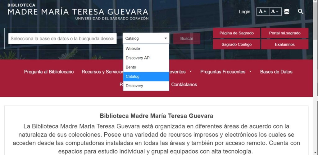 Luego empezamos hablar sobre las varias maneras de encontrar información en línea para sus temas y proyectos. Un lugar bueno y accesible para empezar es la página de nuestra biblioteca, La Biblioteca Madre María Teresa Guevara. Aquí podemos encontrar recursos físicos y en línea. En la página principal, se encuentra la barra de búsqueda. Aquí uno tiene varias opciones de como buscar información. Escogiendo “Catalog”, te dejar buscar libros disponibles en la biblioteca.