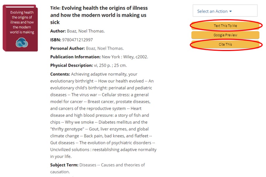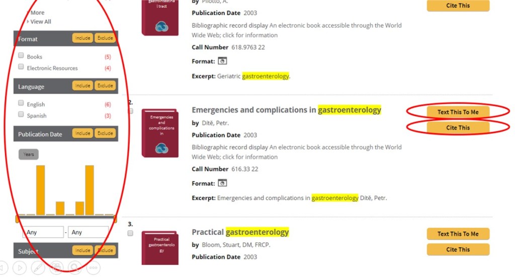 Buscando sobre un tema te va a dar una lista completa de todos los libros disponible en la biblioteca. A la izquierda veras diferentes maneras de refinar tu búsqueda. Por ejemplo, podrías cambiar la fecha de publicacion, el idioma, el formato y varias otras cosas para ayudarte encontrar lo que estas buscando. A la derecha del título veras las opciones de mandarte un mensaje de texto con el titulo y autor y de citar el libro.