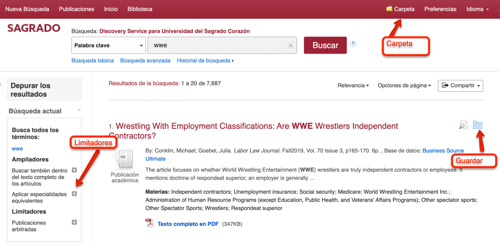 Para buscar en los recursos de la universidad en línea, y no en la librería física, el tab que comienza en “Discovery” se debe de dejar así. De estar entrando por primera vez, una pantalla abrirá pidiendo consentimiento para utilizar información recopilada por el uso de esta plataforma de búsqueda. Es importante seleccionar que sí otorga consentimiento ya que de no hacerlo no se permitirá que utilice el servicio. Al hacer la búsqueda, se pueden usar limitadores para refinar los resultados. Estos incluyen tipo de publicación y año en que fue publicado, entre otros (se encuentra a la izquierda de la pantalla). Si hay un resultado que llama la atención de los encontrados, se puede seleccionar el logo de la carpeta para almacenar los resultados importantes. De querer utilizar o revisar los documentos guardados, se podrán encontrar en la parte superior de la pantalla.