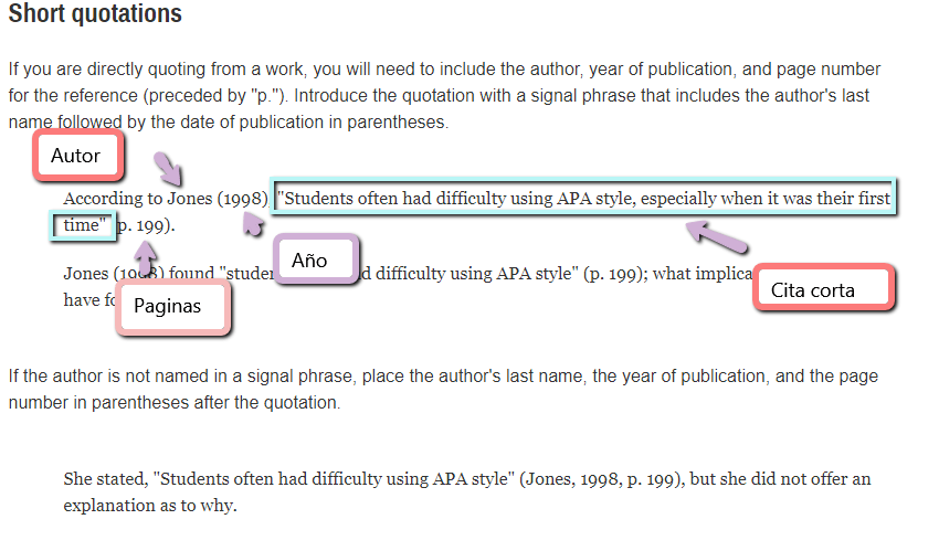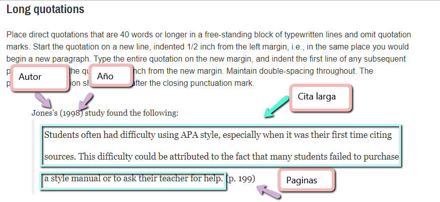 Dentro de las citas existen las citas directas e indirectas. Las citas directas deben estar escritas palabra por palabra lo que dice el autor, estas dividen entre citas largas y cortas. Según el formato APA las citas cortas no deben tener más de 40 palabras. Cuando escribimos una cita corta en APA debemos colocar el texto entre comillas. Estas se utilizan cuando la información que provee el autor es tan importante que no se requiere editar el contexto. En este caso las citas directas al copiar exactamente lo que dice el autor no cometemos plagio ya que luego de hacer uso de su cita le daremos el crédito. Para citar se requieren tres elementos: el autor, el año y las páginas de donde se obtuvo el texto, de esta forma le estarás dando el debido crédito al autor. Por otro lado, las citas largas tienen más de 40 palabras, éstas no deben estar entre comillas. Cuando hacemos uso de las citas directas es indispensable colocar las páginas de donde se obtiene la información. Sin embargo, cuando se utilizan las citas indirecta esto no es necesario, sino que solo debes colocar el autor y año.