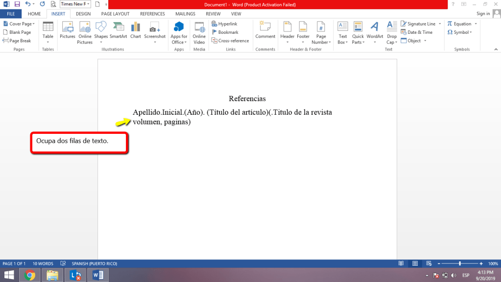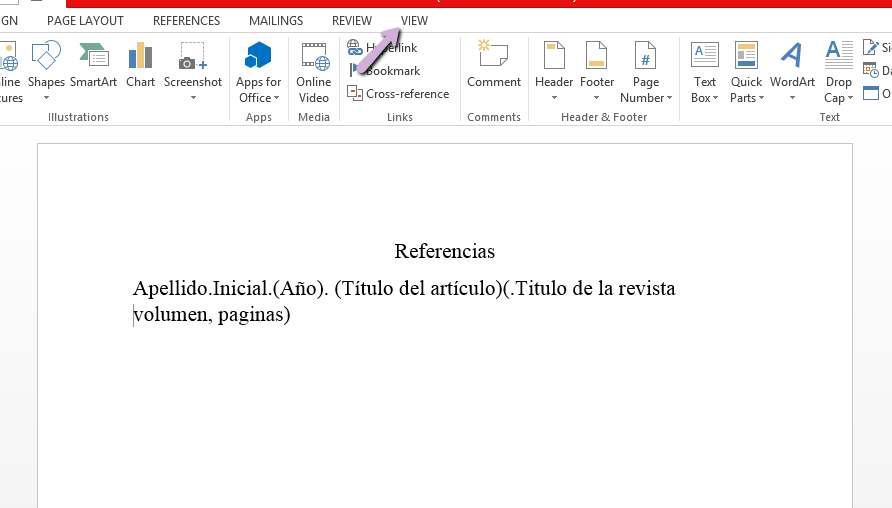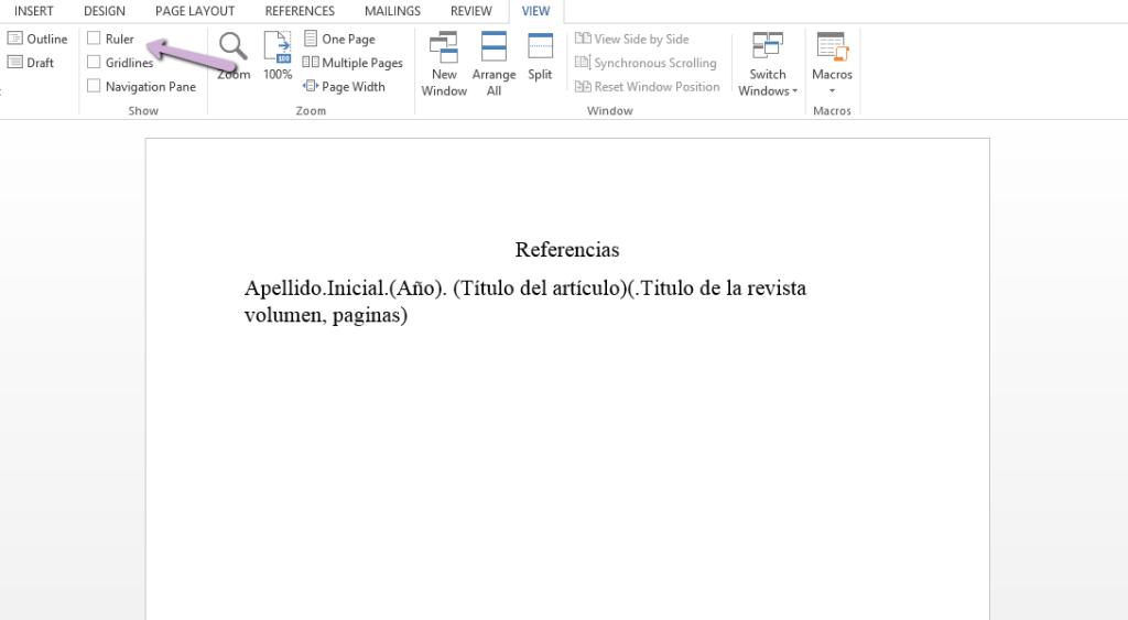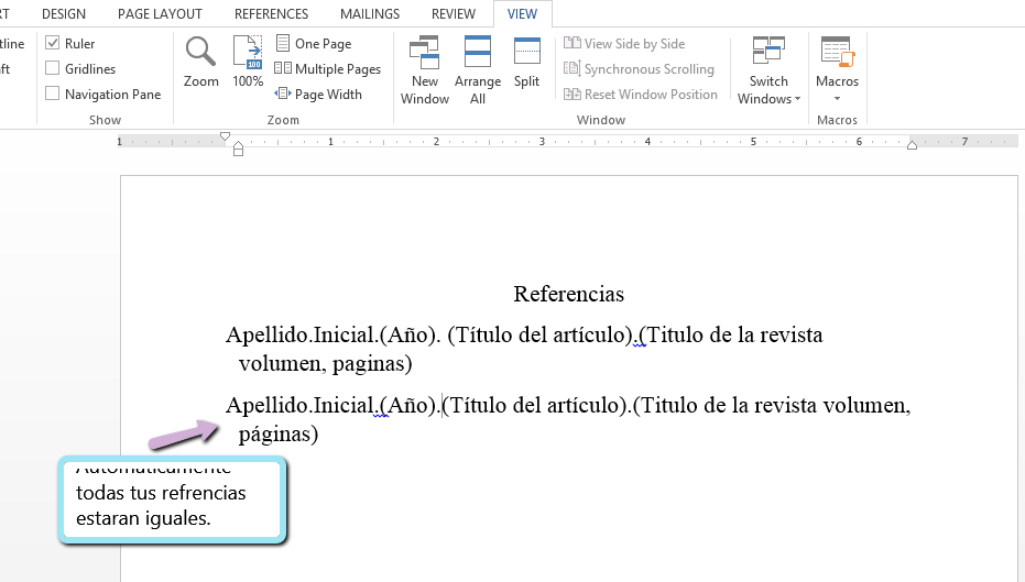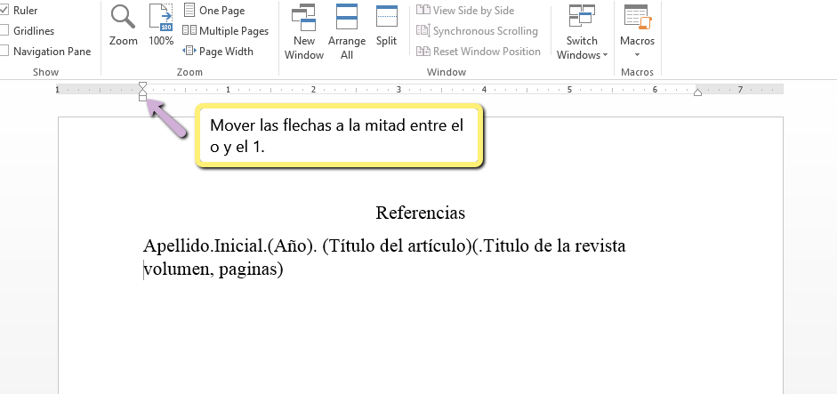 Si tus referencias ocupan más de una línea de texto debes colocar la segunda línea indentada en 5 espacios. Para poder realizar esto debes utilizar el “Hanging indent”. Este se encuentra en la parte superior de tu programa, oprimiendo “view”, luego debes buscar la palabra “ruler” podrás observar que en la parte superior de tu documento aparecerá una regla. Ya escrita tu referencia debes colocar el apuntador frente al texto de la segunda línea, acto seguido, debes mover la flecha de la parte de debajo de tu regla como muestra la foto y arrastrarla hasta la mitad entre el 0 y el 1. Así cuando sigas escribiendo tus referencias que tengan más de una línea de texto podrás hacerlo y se moverá de manera automática.