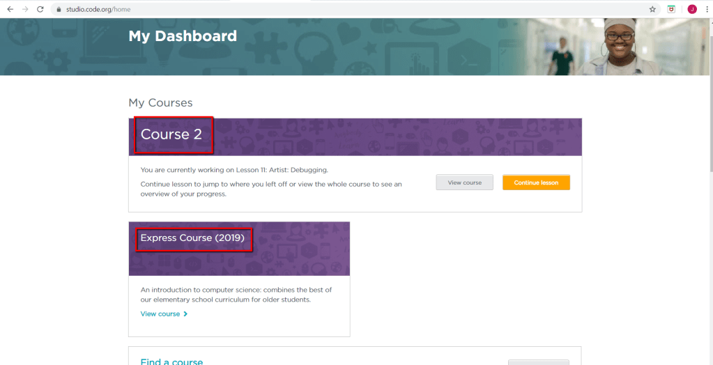 Entramos a nuestra cuenta en code.org , al hacerlo podremos notar que hay dos cursos en el Dashboard si habíamos participado de la clase anterior, Course 2 y Express Course 2019. El primero es el utilizado para hacer ejercicios de práctica junto a la clase o individual, el otro es en el que se harán los ejercicios individuales asignados para puntos.