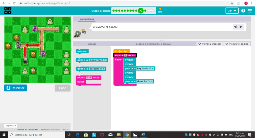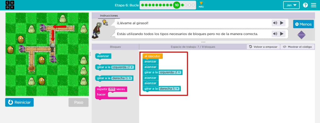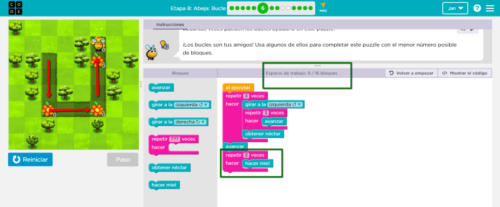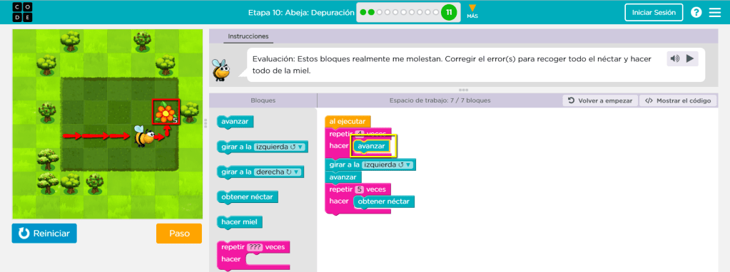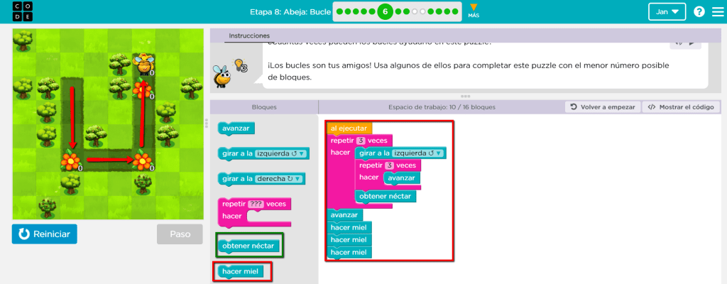 Aparecen bloques nuevos “obtener néctar” que se utiliza sobre las flores y “hacer miel”, usado en las colmenas. Para completar este ejercicio continuamos utilizando el proceso, definir el patrón según la forma de la ruta y establecer la cantidad de veces que se repetirá añadiendo la función de los nuevos bloques. A pesar de que el ejercicio está bien hecho se podría hacer en menos bloques utilizando más “repetir”. Dado el caso se pueden cambiar los últimos “hacer miel” por “repetir 3 veces” alrededor de un “hacer miel”, tal y como se aprecia en la próxima imágen.