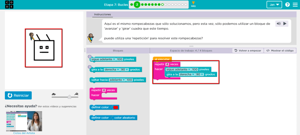 Solo hay que dibujar la parte externa del cuadro sin incluir sus antenas. Al igual que en el ejercicio anterior se establece el patrón y luego se coloca dentro de un bloque de “repetir”. Un cuadrado tiene cuatro lados, esa es la cantidad de veces por las que se repite el patrón. En el siguientes video se explicará la función del bloque “repetir” más detalladamente que en el ejercicio anterior a este.
