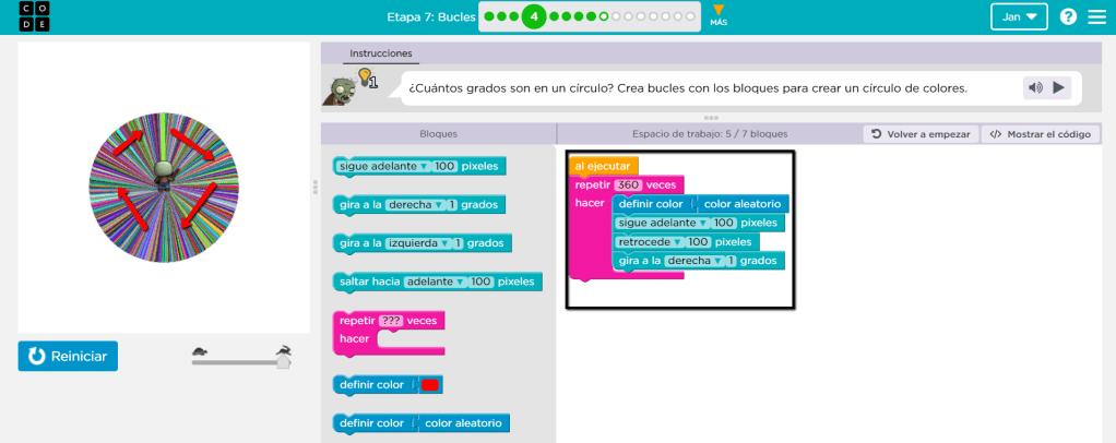 Un círculo mide 360 grados, por eso podemos definir que dentro del bloque “repetir” la cantidad correcta es 360. En este ejercicio es necesario utilizar el bloque “denifir color de forma aleatoria” para pintar de diferentes colores. Además, se utilizan el “seguir adelante”, “retroceder” y “gire a la derecha o a la izquierda” la cantidad de grados dada para poder pintar el círculo porque permiten el movimiento del personaje. Sin embargo, no es la única forma de hacerlo. Un ejemplo de ello es el siguiente: