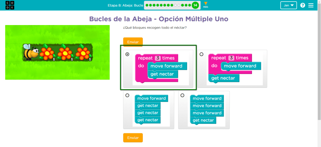 A diferencia de los otros ejercicios, en este se debe analizar los movimientos y escoger la respuesta correcta sin ver al personaje moverse. El patrón sería “move forward”, “get nectar”, “move forward”, “get nectar” y “move forward”, “get nectar”. Esto sería equivalente a un “move forward” y un “get nectar” dentro de un bloque “repetir” con una cantidad de tres. Es decir que la primera es la respuesta correcta.